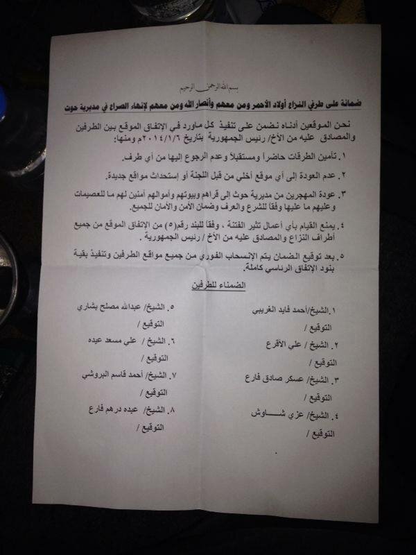 ليتم نزولنا يوم غد لتنفيذ كل تلك الوعود بالتوقيع وتنفيذ الاتفاق بنداً بنداً حسب موافقة الطرفين ودعم ومؤازرة مستمرة من كافة سلطات الدولة ممثلة بفخامة رئيس الجمهورية ومعالي وزير الدفاع و جهود مستمرة للجنة الوساطة المتواجدة هناك و كثير من الخيريين والشرفاء من القادة والمشائخ والأعيان في المنطقة وغيرها من مناطق الجمهورية اليمنية ,,